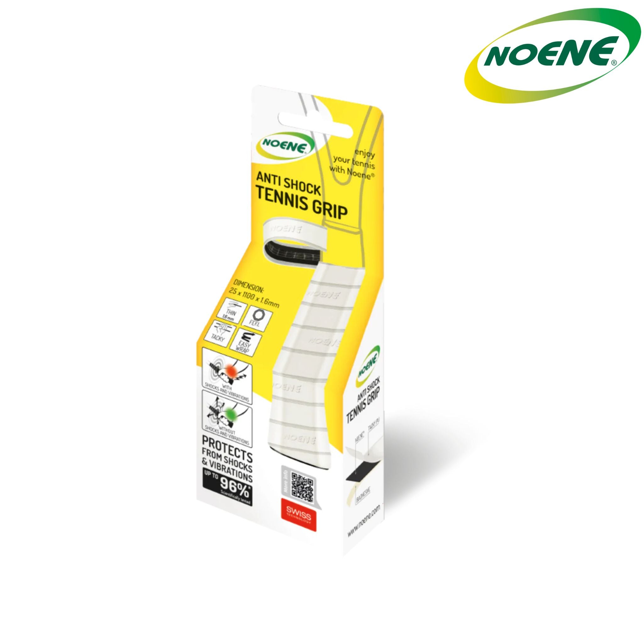 The ANTI SHOCK GRIP TENNIS is thin, lightweight and recommended for competitive players. It protects with a thickness of 1.6 mm without changing the feel of the grip. It is composed of NOENE® material that absorbs and disperses shock and vibration generated by the impact of the racquet with the ball and consequently improves performance, control and grip. Absorption and dispersion of shock and vibration help prevent inflammation and fatigue to joints (hand, wrist, elbow, shoulder, etc…).